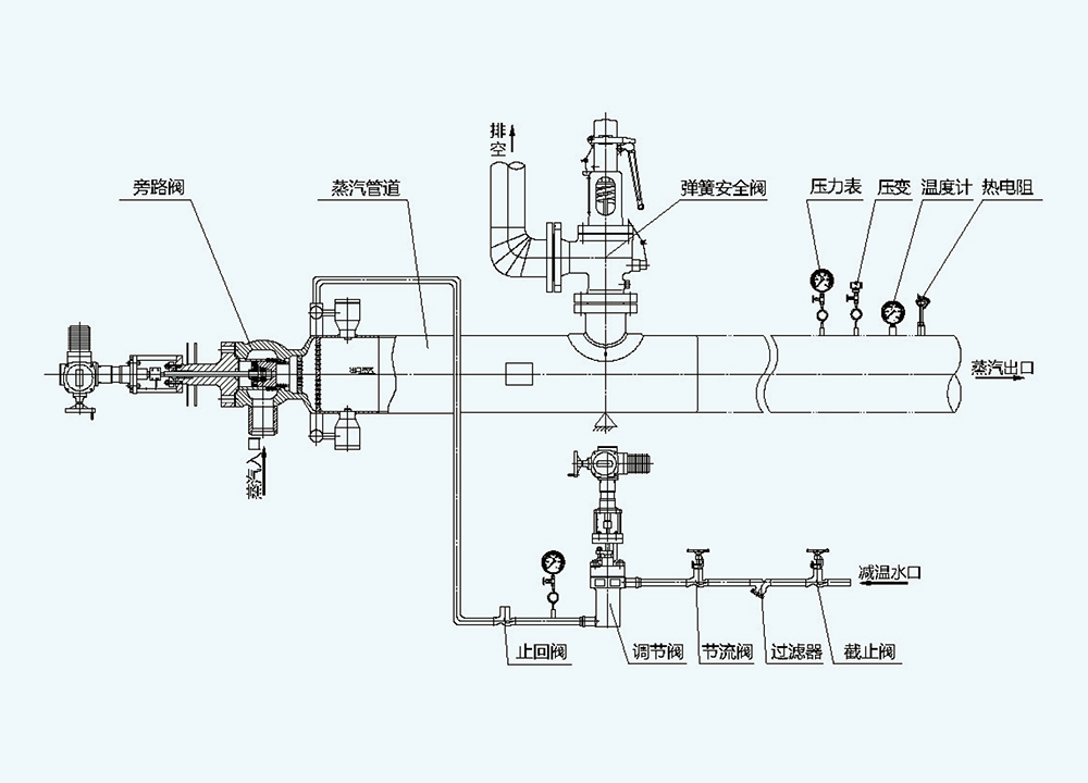 The function of the desuperheating and pressure reducing device is to reduce the pressure and cool the steam produced by the high-pressure steam/high-temperature boiler to the requirements of the factory.